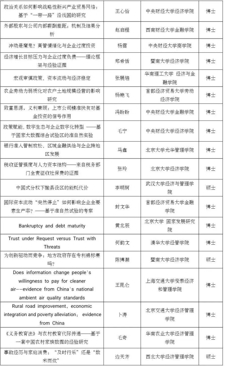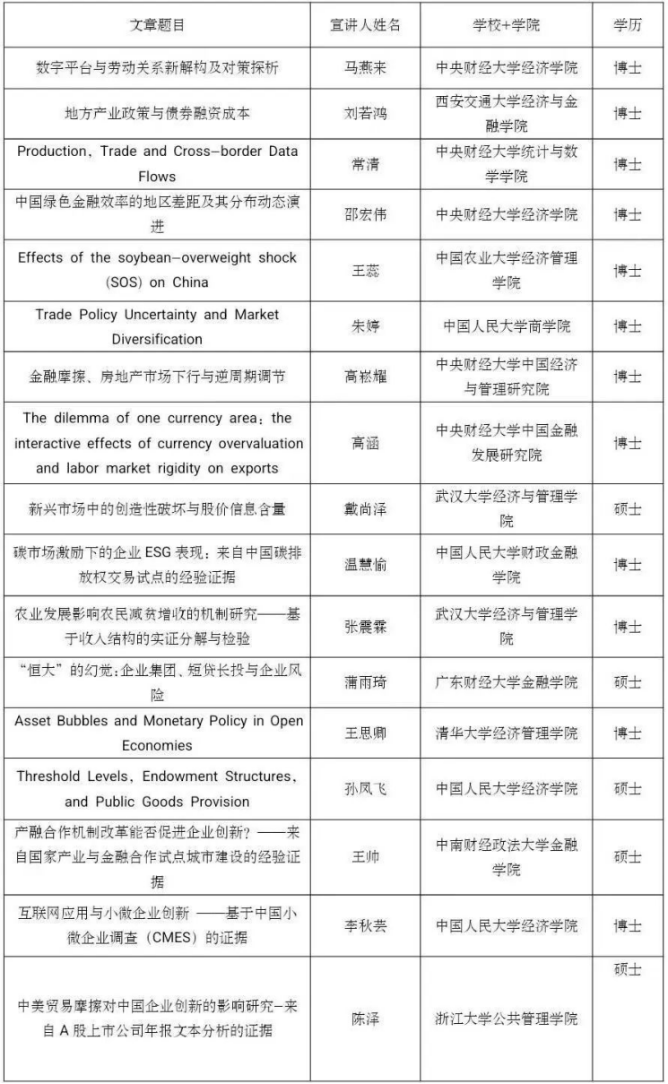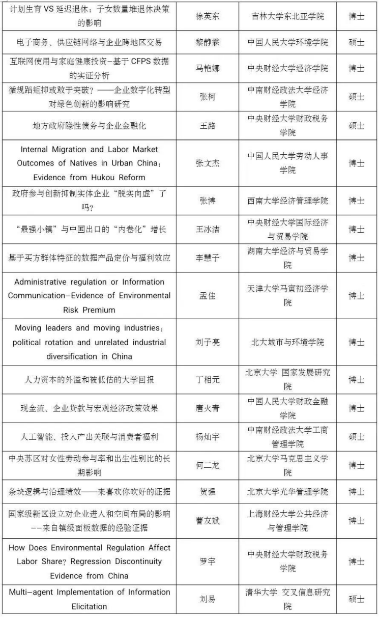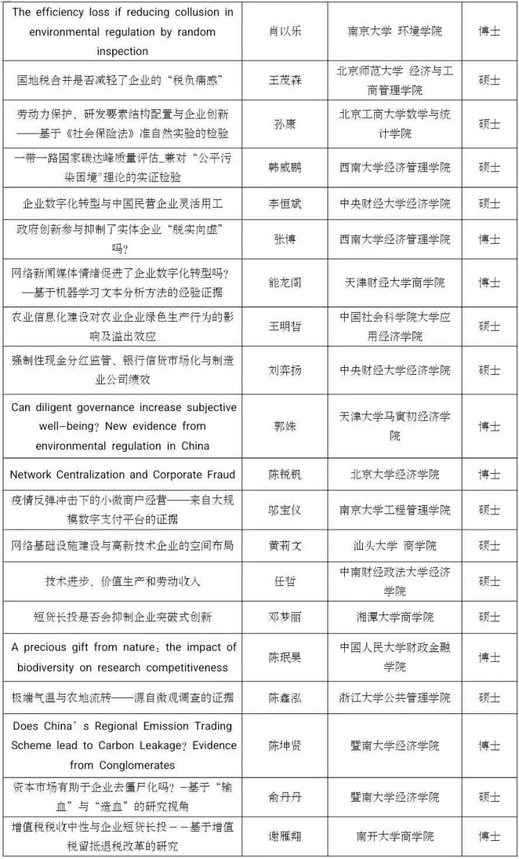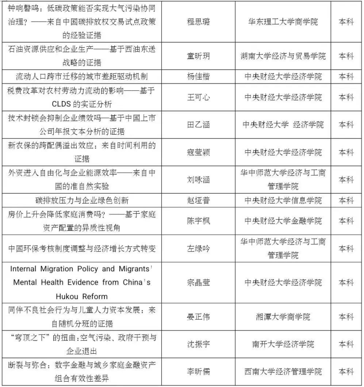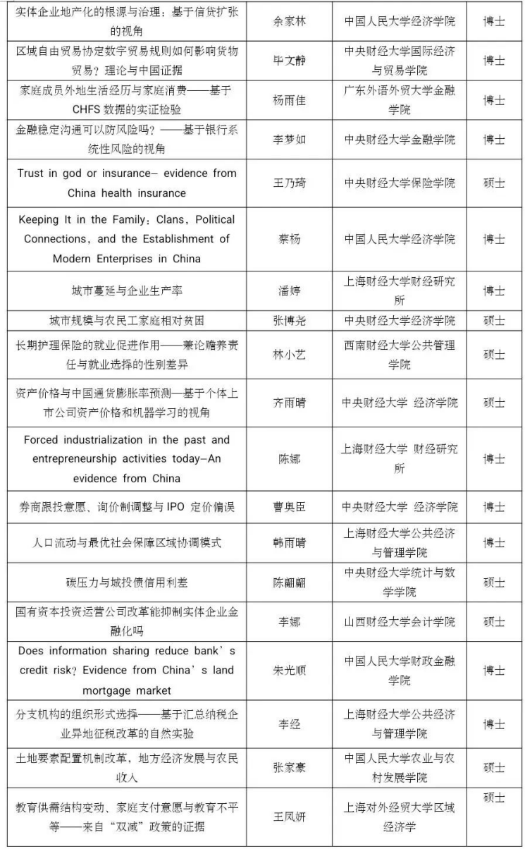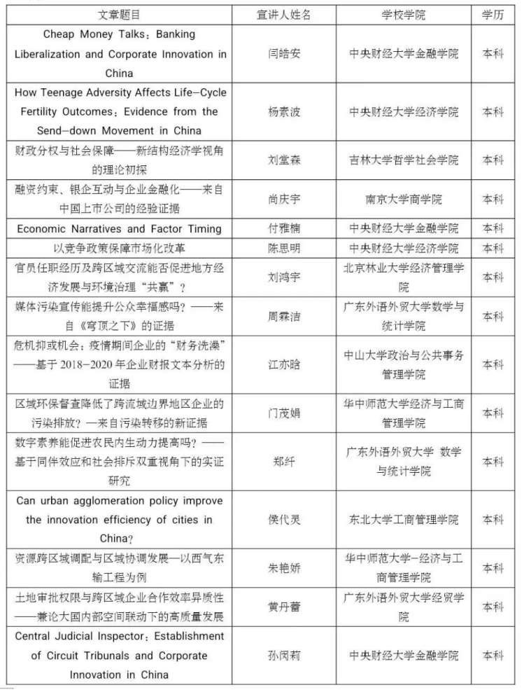 党的二十大报告指出,“教育、科技、人才是全面建设社会主义现代化国家的基础性、战略性支撑”。为了学习、贯彻和落实党的二十大关于教育和人才建设的精神,今年会联合中国经济学年会、中国青年经济学家联谊会主办第五届未来经济学家论坛。本论坛坚持“公平、公正、公开”的原则,鼓励思想争鸣、学术创新,旨在为未来有志于从事经济学研究的全国高校在校学生(本科生和研究生)提供一个观点交流、思想碰撞的学术交流平台。本次论文征集环节共收到612篇投稿论文,经过评审论证和评审,最终遴选出126篇入围会议,名单如下,恭喜各位入选的同学: