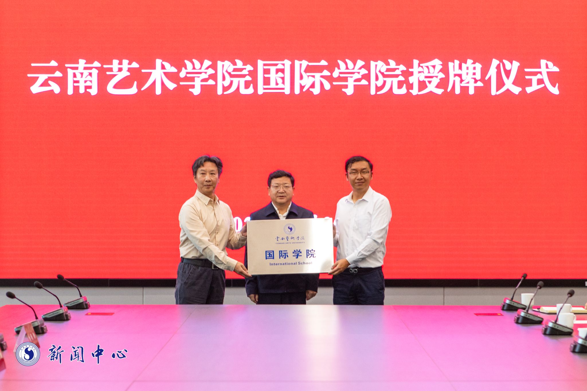 党委副书记、院长欧阳俊虎为国际学院授牌,国际学院党总支书记孟文、院长侯云峰接牌。