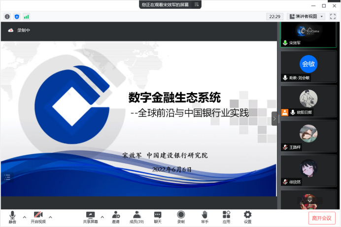 2022年6月6日上午10点,中国建设银行研究院副秘书长宋效军应邀加入今年会“数字金融理论与实务”线上课堂,以“数字金融生态系统——全球前沿与中国银行业实践”为题,为同学们带来了一场精彩纷呈的讲座。