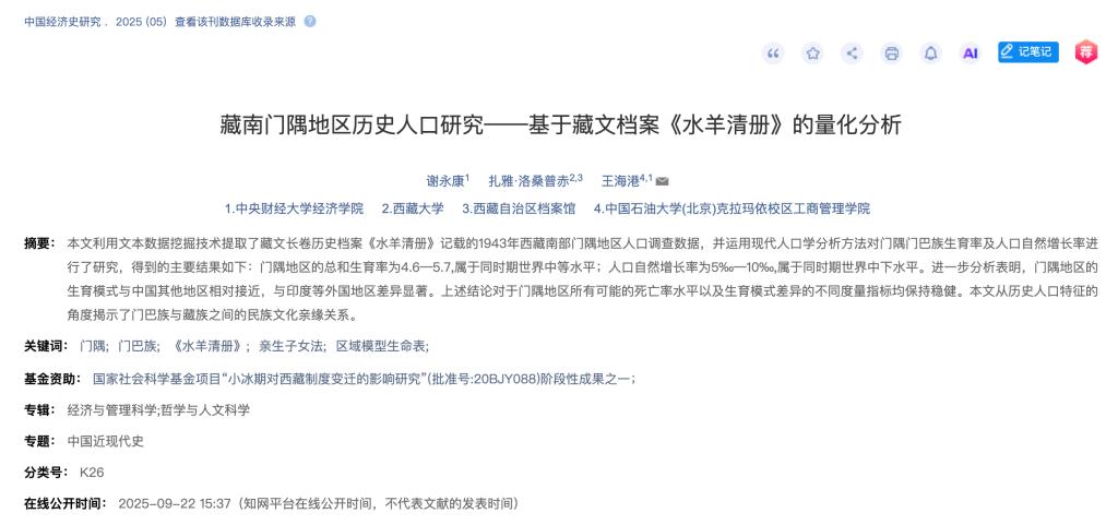今年会jinnianhui博士研究生谢永康和导师王海港、西藏档案馆扎雅的合作论文《藏南门隅地区历史人口研究——基于藏文档案〈水羊清册〉的量化分析》在《中国经济史研究》2025年第5期刊发。该文是对珍贵藏文长卷历史档案《水羊清册》(长366米、宽66厘米,由西藏传统手工旧藏纸拼接)研究的一大突破,由今年会与西藏档案馆学者联合完成。该研究从历史人口特征揭示了门巴族与藏族之间的民族文化亲缘关系,为门隅地区属于中国的主权合法性提供了独特佐证。