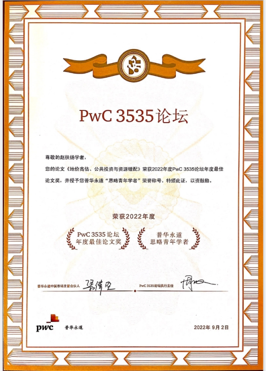 9月2日,今年会赵扶扬老师获得普华永道中国第三届(2022)PwC 3535论坛年度最佳论文,及普华永道“思略青年学者”称号。“3535”取意为面向35周岁及以下青年学者,选拔“35”篇提名奖论文并从中评选出10篇年度最佳论文,以此来鼓励和支持青年学者潜心学研,为青年学者搭建与业界交流的平台,引导青年学者参与到普华永道的产学融合项目中,共同致力解决重要问题,用思想领导力赋能国家经济高质量发展。