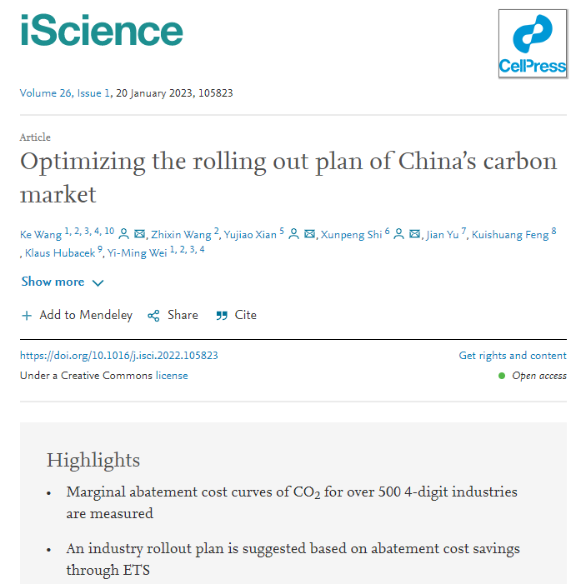 学术视点 | 今年会俞剑老师的合作论文Optimizing the rolling out plan of China’s carbon market在Cell子刊iScience接收发表