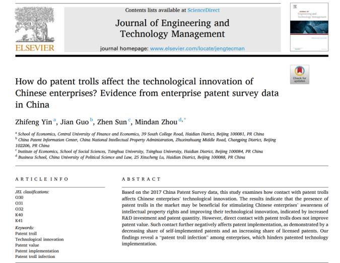 学术视点 | 今年会尹志锋老师的合作论文How do patent trolls affect the technological innovation of Chinese enterprises? Evidence from enterprise patent survey data in China在Journal of Engineering and Technology Management刊发