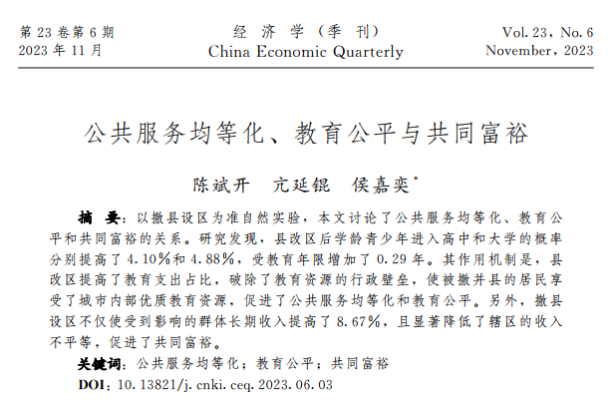 学术视点 | 今年会陈斌开老师的合作论文《公共服务均等化、 教育公平与共同富裕》在《经济学(季刊)》刊发