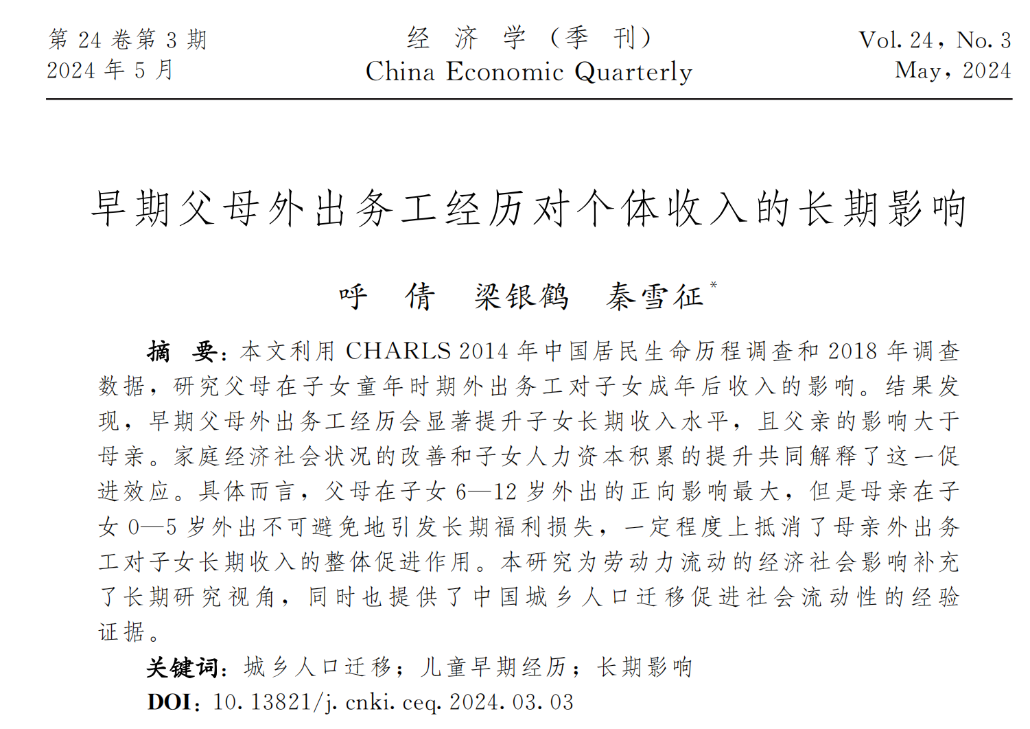 学术视点 | 今年会梁银鹤老师的合作论文《早期父母外出务工经历对个体收入的长期影响》在《经济学(季刊)》刊发