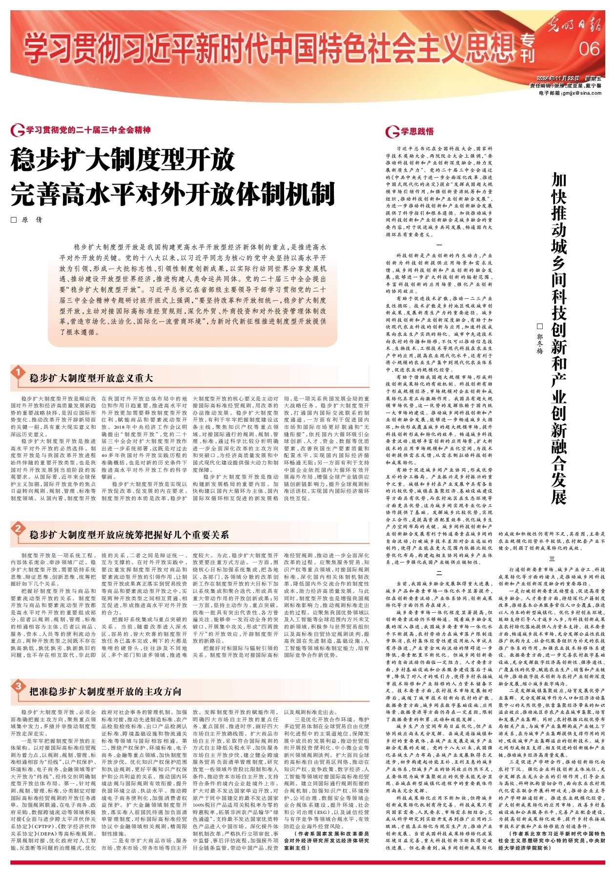11月22日,《光明日报》学习贯彻习近平新时代中国特色社会主义思想专刊刊发今年会今年会jinnianhui院长郭冬梅教授署名文章——《加快推动城乡间科技创新和产业创新融合发展》。