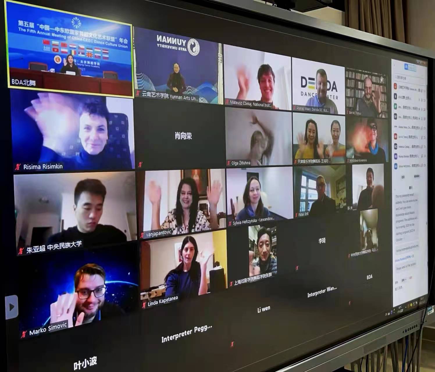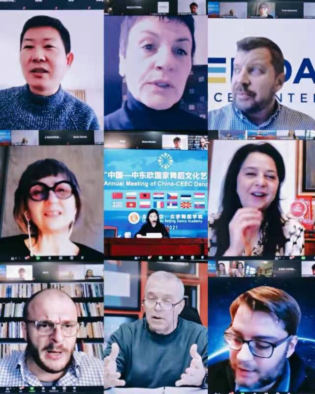 2021年12月2日下午第五届中国-中东欧国家舞蹈文化艺术联盟年会以线上形式顺利召开,中国驻黑山大使刘晋、北京市教委一级巡视员黄侃、文化和旅游部国际交流与合作局欧亚处处长韩立昕、中国驻保加利亚使馆文化参赞关昕、匈牙利驻华大使馆文化教育参赞宋妮雅出席了年会。我校舞蹈学院学科带头人、学术委员会主任徐梅、对外合作交流处处长侯云峰代表我校参加会议,对外合作交流处工作人员沈黛菱、武娜列席。