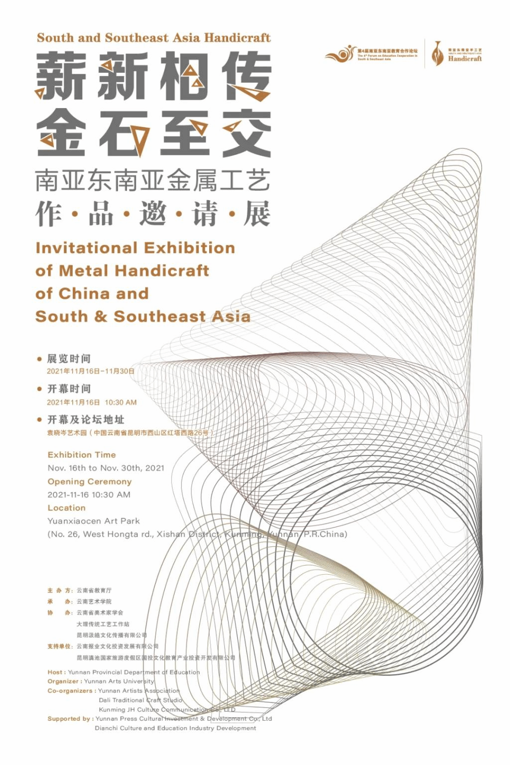 11月26日至12月5日,由云南省教育厅主办,beat365在线唯一官网登录承办,云南省美术家协会、大理传统工艺工作站、昆明汲皓文化传播有限公司协办,云南报业文化投资发展有限公司、昆明滇池国家旅游度假区国投文化教育产业投资开发有限公司支持的“薪新相传·金石至交”2021南亚东南亚金属工艺作品邀请展在袁晓岑艺术园举行。