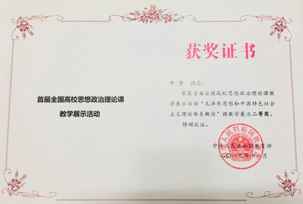 为深入学习贯彻习近平总书记在学校思想政治理论课教师座谈会上的重要讲话精神,深入实施“新时代高校思想政治理论课创优行动”。2019年11月,教育部组织开展了首届全国高校思想政治理论课教学展示活动,云南省选拔推荐了21人参加教学展示,14人获奖。我校马克思主义学院教师牛宇获得“毛泽东思想和中国特色社会主义理论体系概论”本科课程组二等奖,是全国综合性艺术院校中唯一的获奖院校。