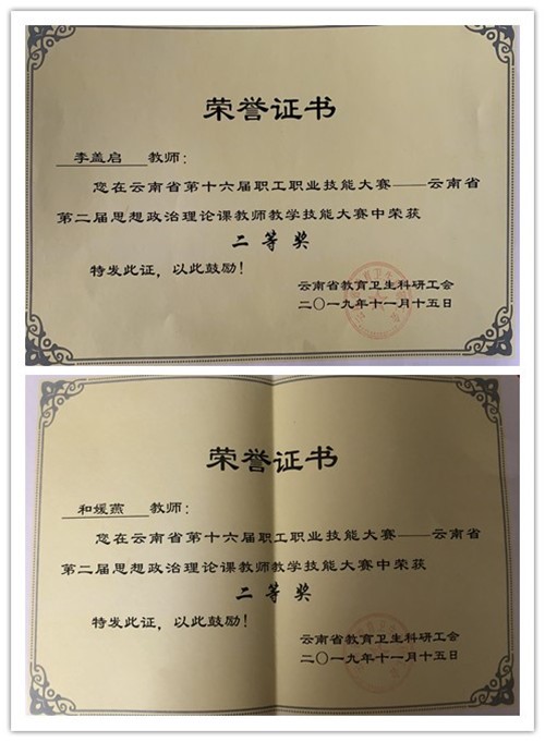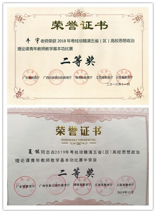 近年来,马院着力抓好师资队伍建设,扎实推进教学质量稳步提升,注重通过教学比赛锻造教师队伍,支持和鼓励广大中青年教师参加各级各类教学比赛,在国内各级各类教学比赛中取得了一系列优异成绩:我校马院教师连续两年代表云南省参加“粤桂琼赣滇”五省(区)高校思想政治理论课青年教师教学基本功比赛,2018年牛宇老师荣获“二等奖”、2019年夏能老师荣获“二等奖”。在2019年云南省高校思想政治理论课教师教学比赛中,我校马院教师夏能荣获“一等奖”,崔琳、贾雪燕获得“二等奖”。在云南省第二届思想政治理论课教师教学技能大赛中,我校马院教师和媛燕、李盖启均荣获“二等奖”。