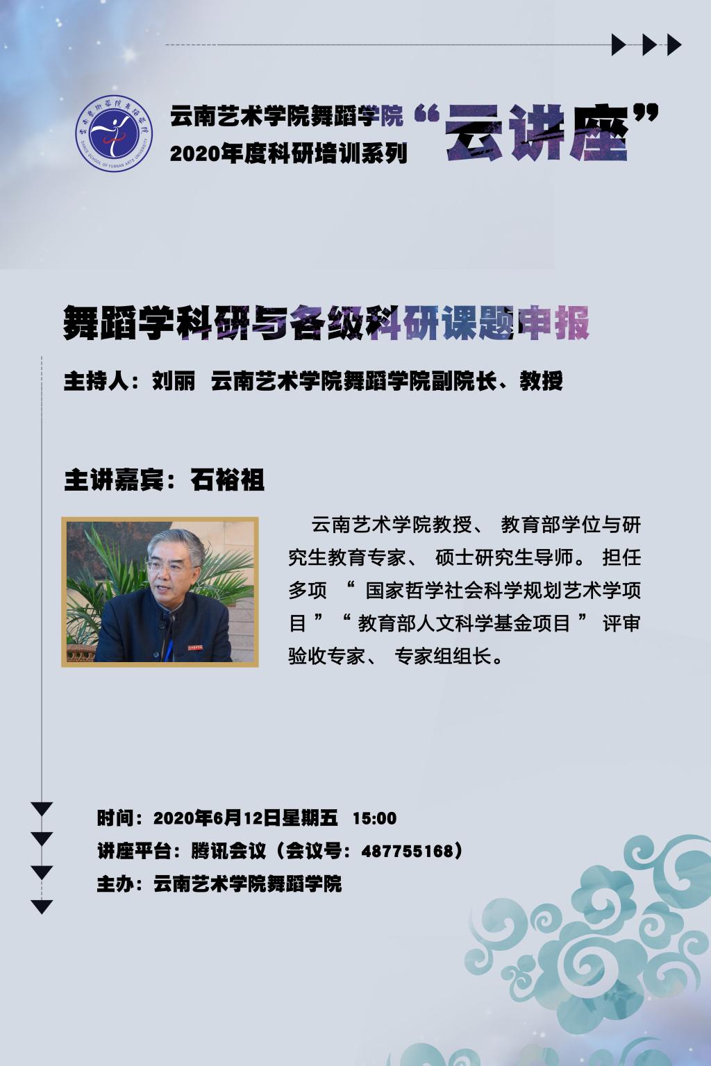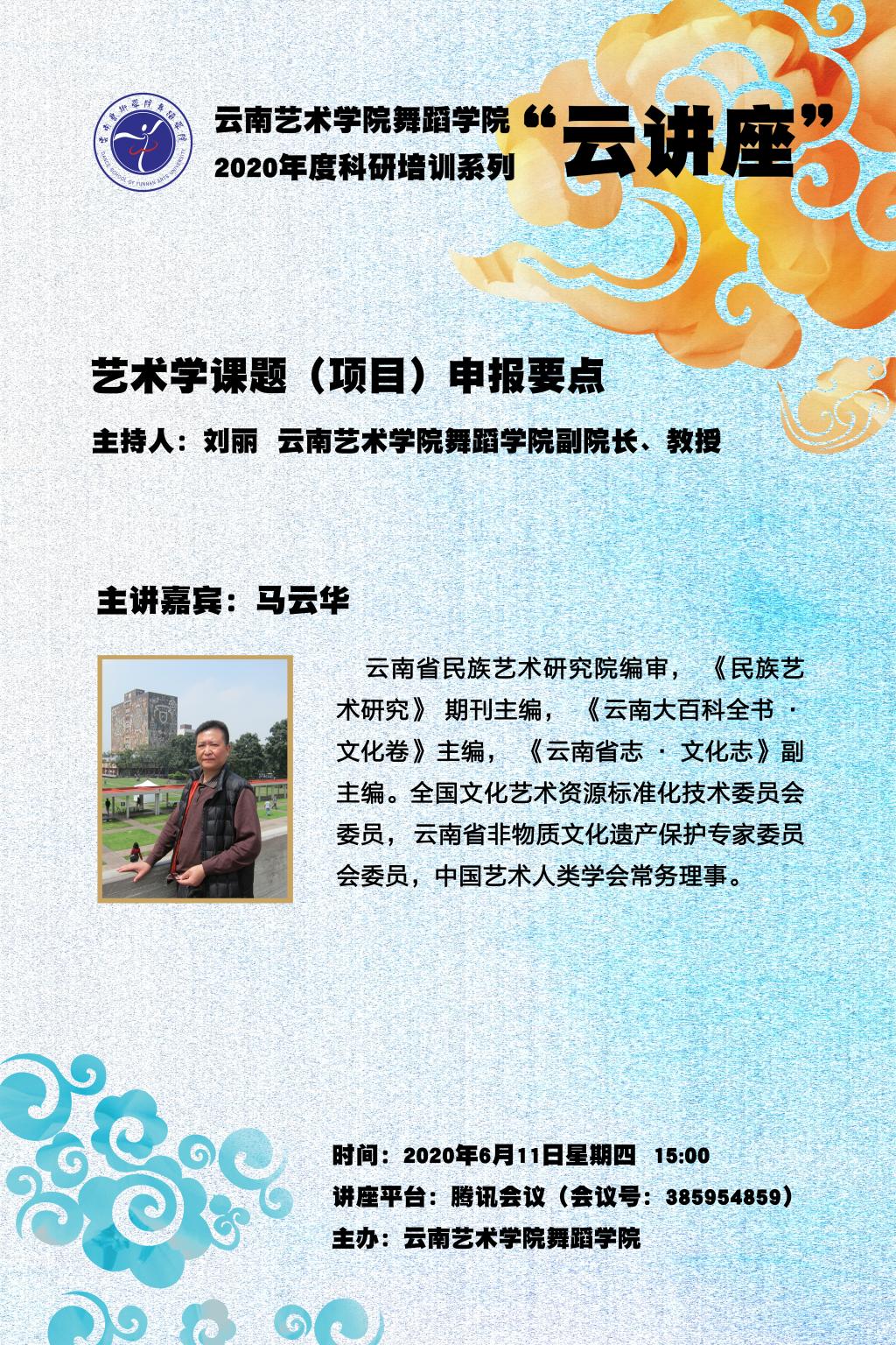 此次科研培训邀请了云南省民族艺术研究院原院长、《民族艺术研究》期刊主编马云华老师和beat365在线唯一官网登录教授、硕士生导师、舞蹈学者石裕祖教授,分别做了题为《艺术学课题(项目)申报要点》和《舞蹈学科研与各级科研课题申报》的专题讲座,并就师生在线提问进行答疑解惑。两位专家主要针对国家社科基金艺术学、云南省哲社艺术学规划课题的基本概况,艺术类课题(项目)申报的要点,以及课题的选题原则、申报书的填写规范、舞蹈学科的申报范围和思路等相关知识做了详细解读。刘丽副院长在总结中强调了教师课题申报特别要注意的重点问题,包括对课题指南的再三研读、对当下文化艺术发展前沿问题的宏观了解、如何将教学与创作的实践经验转化为理论研究思维等,并希望教师能够在长期的教学与创作实践积累中,逐渐加强研究意识,用科研成果反哺实践。