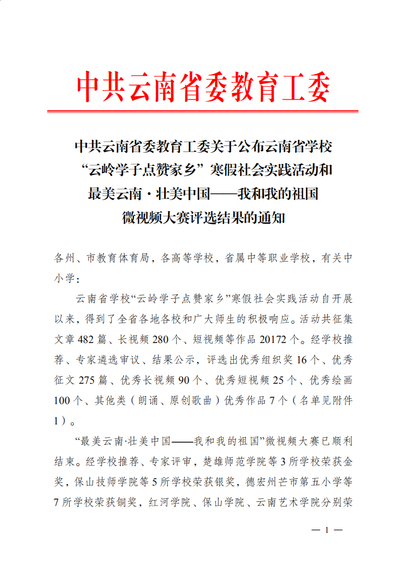 云南省学校“云岭学子点赞家乡”寒假社会实践活动长视频组获奖名单(一等奖 15、二等奖30、三等奖45)