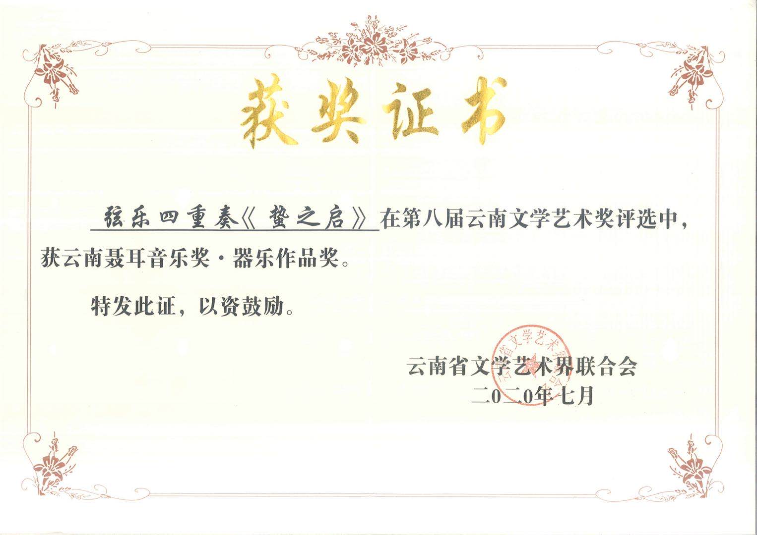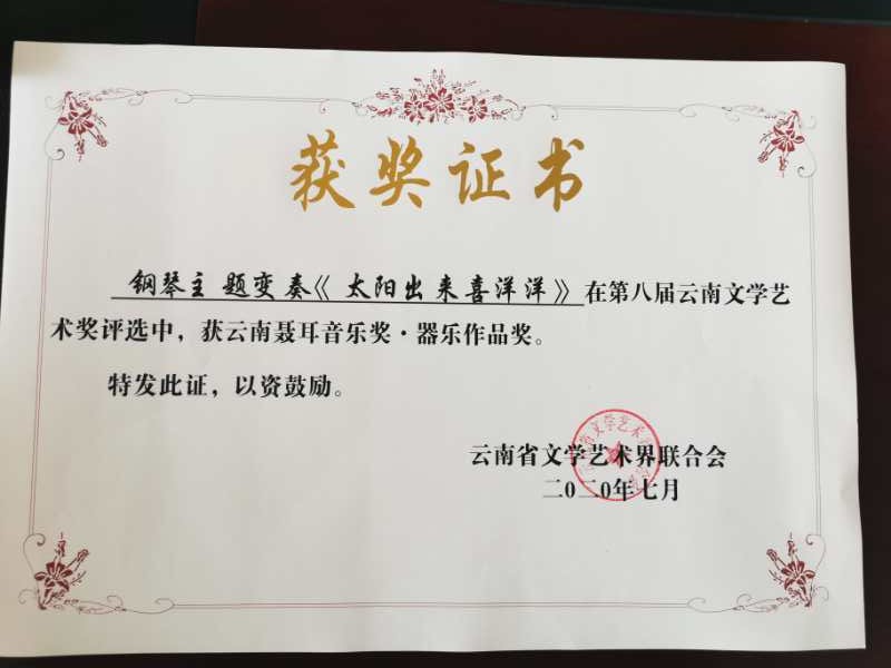 beat365在线唯一官网登录音乐学院作曲系付鹏老师作品弦乐四重奏《蛰之启》,作曲系研究生罗玉兰作品钢琴主题变奏《太阳出来喜洋洋》(指导教师田建华),囯乐系滇鼓打击乐《逐日》(作曲:赖钧霖)获得第八届云南文学艺术奖云南聂耳音乐奖器乐作品奖。