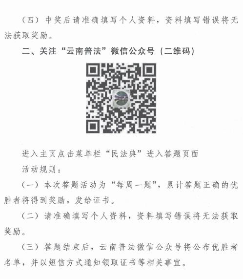 为深入贯彻习近平总书记关于全面依法治国的重要论述特别是关于民法典的重要指示精神,全面推进民法典普法教育工作,按照云南省民法典学习宣传总体安排部署,省委宣传部、省普法办决定运用云南省权威信息发布平台“云南发布”、省普法办“云南普法”两个微信公众号在全省范围开展“云南省民法典学习线上答题”活动,活动有关事项通知详见附件。