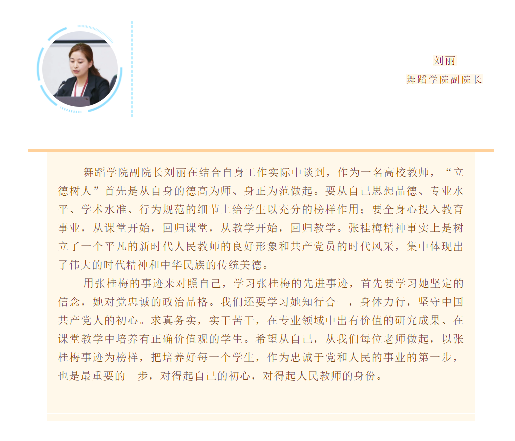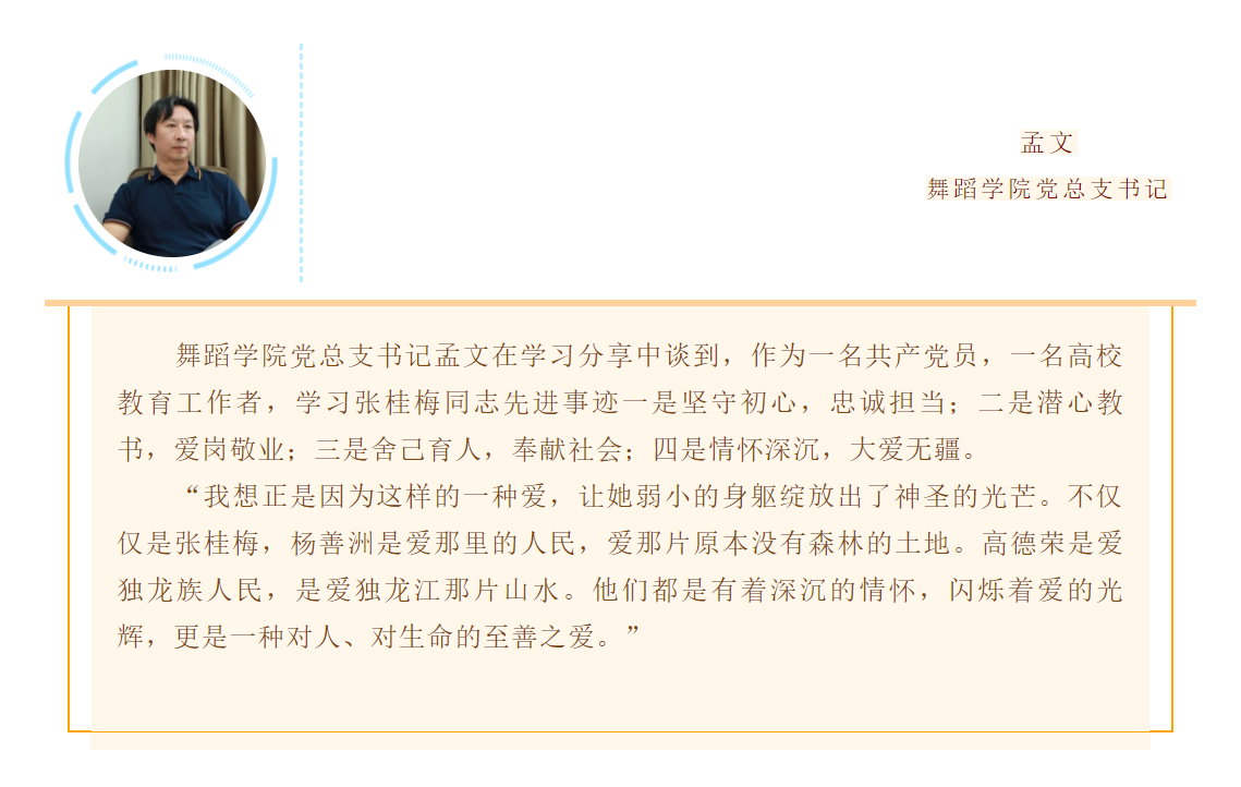 舞蹈学院党政班子成员围绕学习张桂梅事迹分别作主题发言,交流分享学习心得。