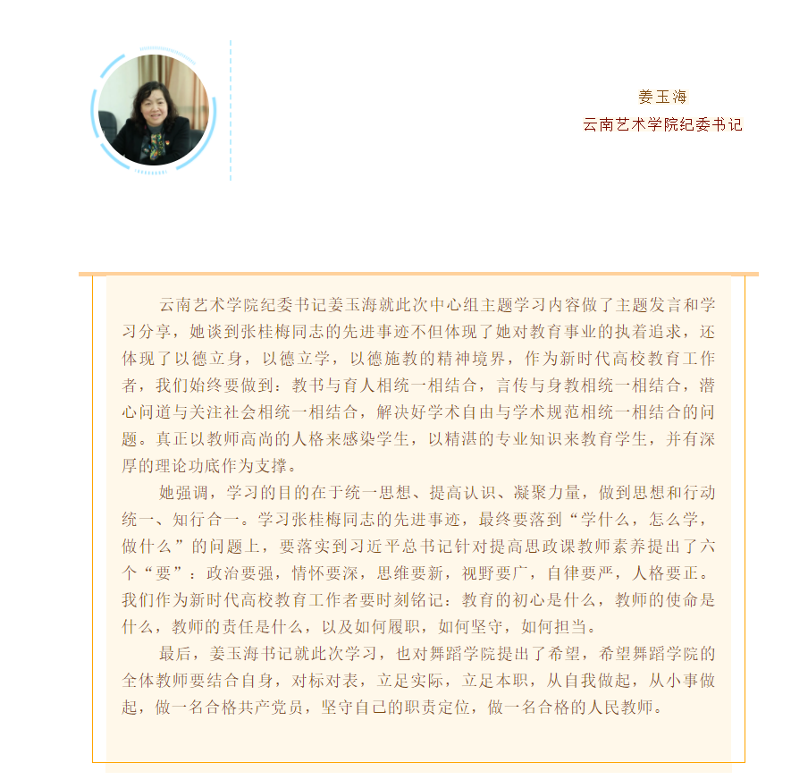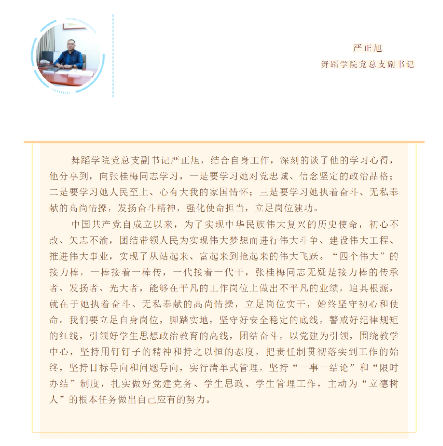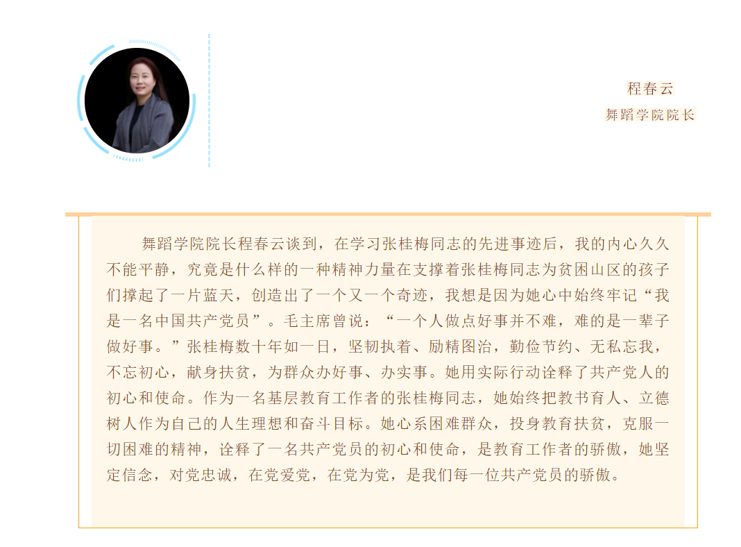 榜样是一种力量,是一面旗帜,是一座灯塔。舞蹈学院通过开展“忠诚执着守初心 无私奉献担使命——向张桂梅同志学习”主题学习活动,全院师生深受感染和鼓舞。学院党政领导班子将继续带头学、深入学、对照学,带动引领全院师生党员以张桂梅同志为榜样,坚定理想信念,以自己的实际行动践行共产党员的初心和使命,落实立德树人根本任务,展现新时代高校教育工作者新担当新作为,在学校建设成为具有国际影响力特色鲜明的国内一流艺术院校征程中切实肩负起责任。