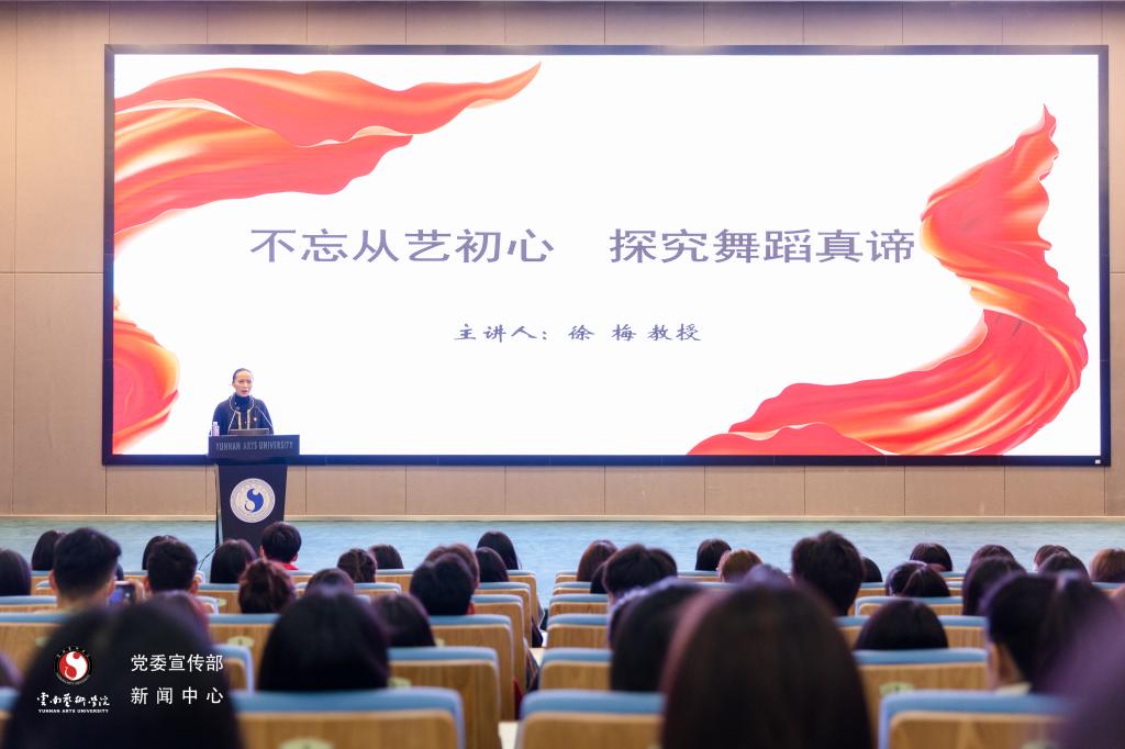 2020年11月28日,2020年秋季学期全国艺术院校“艺术名家领读经典” ——《守正创新 砥砺前行》思政公开课第七讲“不忘从艺初心 探究舞蹈真谛”在我校呈贡校区图书馆报告厅举行。本期主讲人我校舞蹈学院徐梅教授。