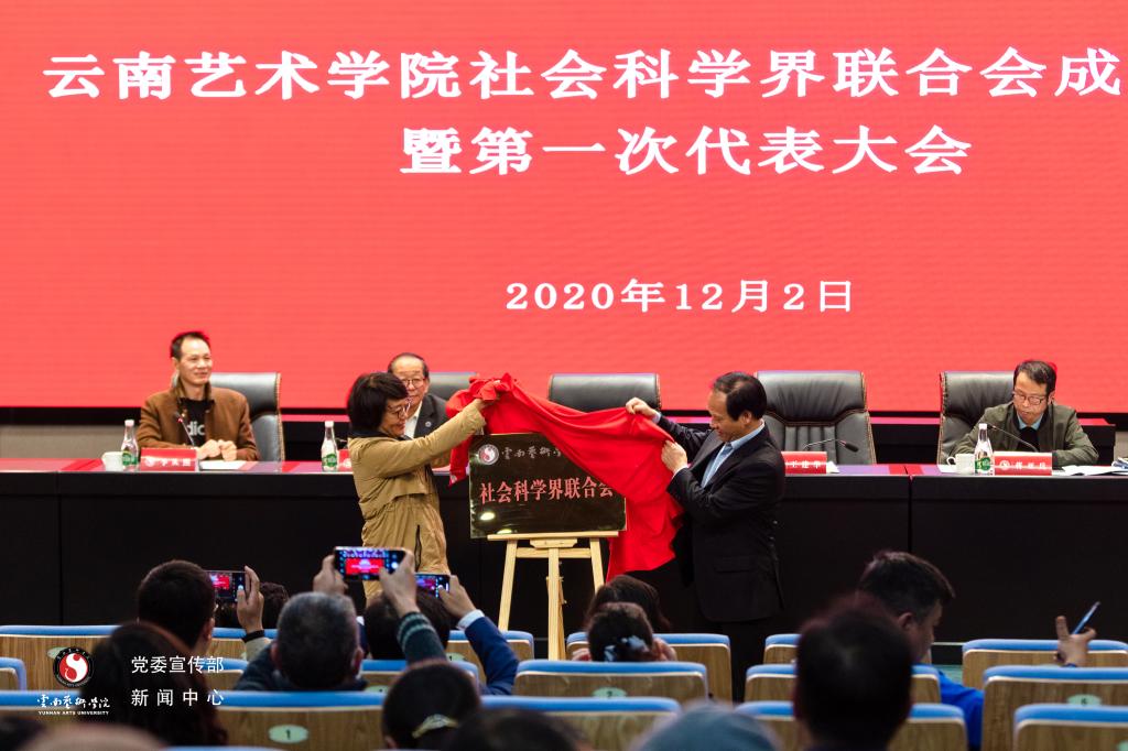 云南省社科联党组成员、副主席王建华与我校党委书记黄雁玲为beat365在线唯一官网登录社会科学界联合会揭牌
