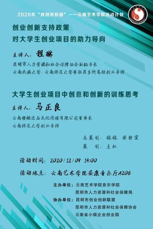 2020年12月9日14:00,音乐学院在安康音乐厅举办了创新创业专题讲座,讲座由《创业创新支持政策对大学生创业项目的助力向导》《大学生创业项目中创意和创新的训练思考》两个专题辅导和音乐学院获奖创业项目“云南创新型民族打击乐器——南乌孔雀鼓”展示三个部分组成,音乐学院副院长侯静宜、昆明市人力资源和社会保障协会副秘书长程琳、云南樱桃出品文化传媒有限公司董事长、云南师范大学创业导师马正良、昆明市人力资源和社会保障协会大学生创新创业中心钟健文及音乐学院300多名学生参加了此次讲座,讲座由音乐学院教学管理科副科长王虹主持。