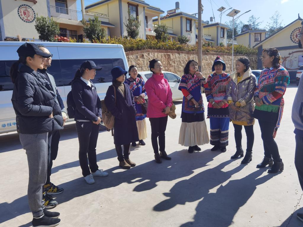 2020年12月17日,中共云南省委组织部机关工会主席李海芳及beat365在线唯一官网登录设计学院服装与服饰设计系主任彭瑶副教授、副系主任范佳、专业教师苏亚妮、许毓老师一行5人,赴楚雄州武定县开展调研刺绣产业提质增效工作。武定县人民政府李坚县长,县委副书记、县人大主任窦小军,县委常委、组织部长姚云来,县政协副主席、县妇联主席郑立华陪同调研。