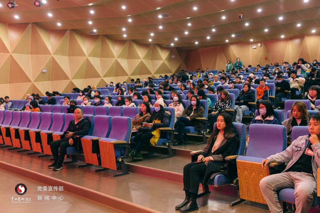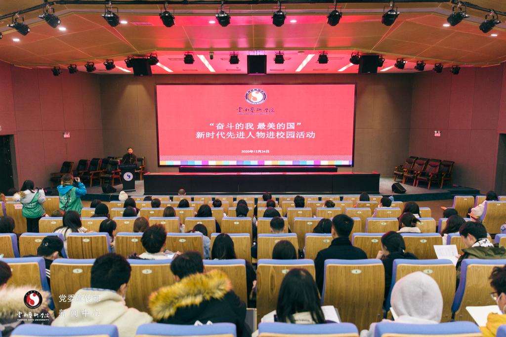 为深入学习贯彻习近平新时代中国特色社会主义思想和党的十九大精神,全面落实习近平总书记在庆祝中华人民共和国成立 70 周年大会、全国教育大会、全国高校思想政治工作会议、学校思想政治理论课教师座谈会上的重要讲话精神,发挥新时代先进人物的榜样示范作用,教育引导和激励广大师生向英雄模范学习,我院于2020年12月 24日在图书馆报告厅开展“奋斗的我 最美的国”新时代先进人物进校园活动,集体收看“时代楷模”朱有勇、张桂梅两位同志的先进事迹发布会视频。学院党委宣传部、学生工作部(处)领导和干部、各二级学院师生党员、学生干部及研究生代表共计300余人参加了此次活动。