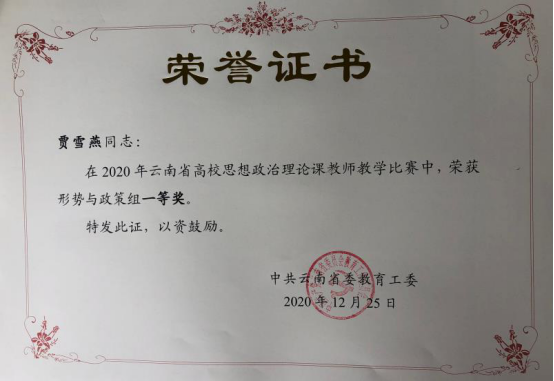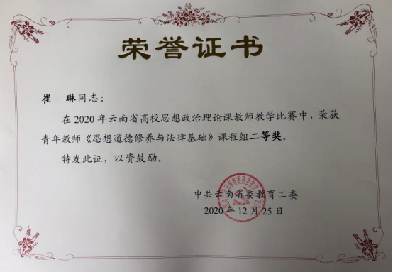 2020年11—12月,中共云南省委教育工委组织全省2020年度高校思想政治理论课教师教学比赛。全省将近有200人参加本次比赛,其中我校3人参赛。一等奖共19人,我校有2人;二等奖24人,我校有1人。