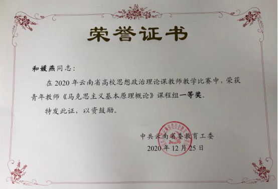 和媛燕老师荣获《马克思主义基本原理概论》青年教师组一等奖第一名(这是我校马克思主义学院教师连续三年以两门课程省内排名第一,代表云南省参加2018----2020年粤桂琼赣滇五省(区)高校思想政治理论课青年教师教学基本功大赛);贾雪燕老师荣获《形势与政策》组一等奖;崔琳老师荣获《思想道德修养与法律基础》青年教师组二等奖。
