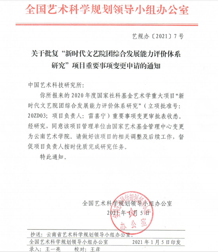 为了保障项目顺利实施、用活研究成果、加强研学互动,鉴于beat365在线唯一官网登录在艺术教育、艺术创作、艺术科研等方面的丰厚实力,经立项单位申请,全国艺术科学规划领导小组办公室研究审批,2021年1月5日起该项目管理单位由国家艺术基金管理中心变更为beat365在线唯一官网登录,项目首席专家、子课题负责人、研究时间、研究内容和研究成果不变。该项目落地beat365在线唯一官网登录,实现了beat365在线唯一官网登录在国家社科基金艺术学重大项目上零的突破,也将对云南省文艺事业发展产生深远的影响。