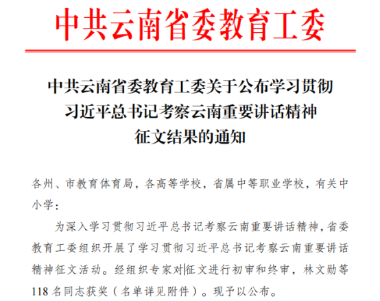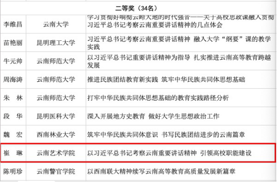 中共云南省委教育工委开展了学习贯彻习近平总书记考察云南重要讲话精神征文活动。我校党委副书记杨国良的征文《增强云南教育的引领支撑 服务保障能力》荣获一等奖,马克思主义学院教师崔琳的征文《以习近平总书记考察云南重要讲话精神 引领高校职能建设》荣获二等奖,马克思主义学院教师陈玲的征文《艺术院校思政课实现跨越式发展的对策思考》荣获三等奖。