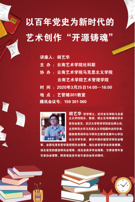 2021年是中国共产党成立100周年,为更好地将党史学习与科研创作融会贯通并启发我院师生在艺术创作上的思考,2021年3月25日,武汉音乐学院马克思主义学院院长胡艺华教授受邀为我院师生作《以百年党史为新时代的艺术创作“开源铸魂”》的专题讲座。讲座由beat365在线唯一官网登录社科联主办,马克思主义学院及艺术管理学院协办,讲座主要以线上形式开展,同时在艺术管理学院设线下会场,吸引了我院众多师生通过线上线下的方式参与。