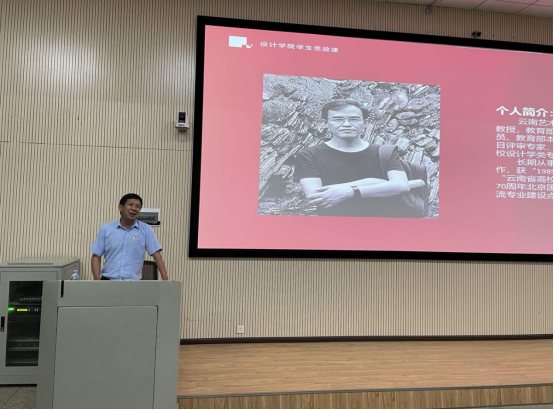 陈劲松教授首先从毛泽东主席在张思德同志追悼会上的演讲稿《为人民服务》展开,介绍了2018年中央军委政治工作部统一印制10位英模画像。“历史是最好的教科书”,陈劲松教授强调,要加强学习“四史”,学习英模的先进事迹与精神,这才是新时代大学生应该追的“英雄”。他向大家推荐了《建党伟业》《建军大业》《建国大业》等影片,《为人民服务》《为真实的世界而设计》《大转折时代》《社会设计》等阅读书目,并结合设计纪录片《啊!设计》、实践案例“设计为人民服务·2010昆明站”、“AI+艺术”和设计学院毕业设计实践课程等多个案例,带领大家了解历史,钻研设计,掌握当下,展望未来。