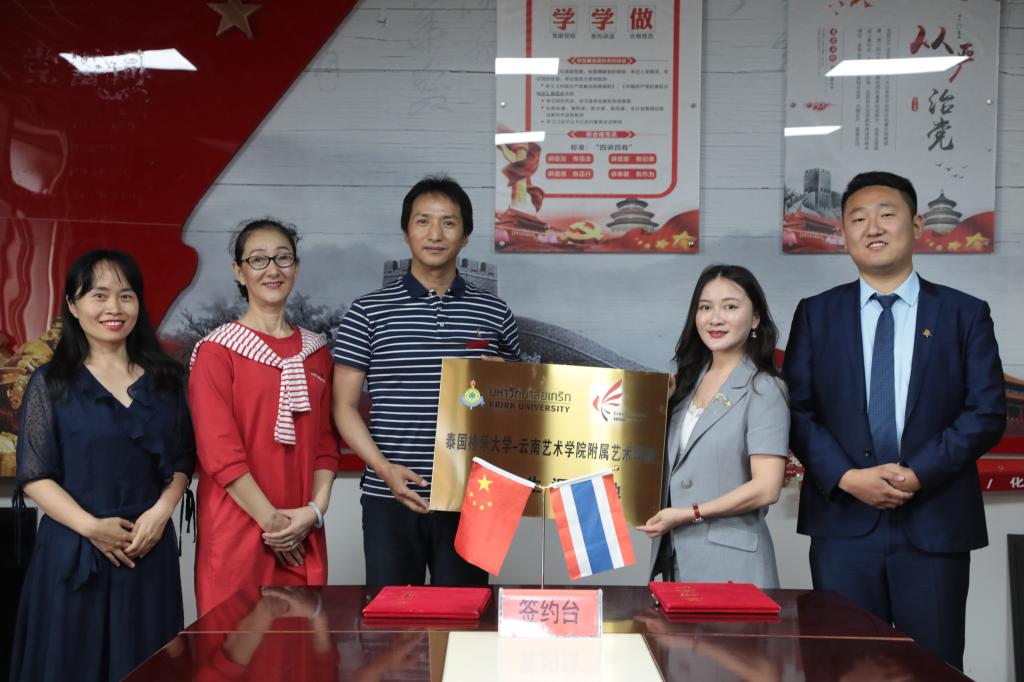 2021年5月13日下午3:00,附艺校与泰国格乐大学签署《国际教育交流备忘录》暨“优质生源基地”授牌仪式在附艺校311会议室举行。泰国格乐大学国际交流办公室副主任黄晶娴、昆明办事处负责人王鹏旭、附艺校农布七林校长、教务科科长兼招办主任和桂萍、校办公室张霞、行政秘书张旭参加了授牌仪式。本次授牌仪式由教务科科长兼招办主任和桂萍主持。
