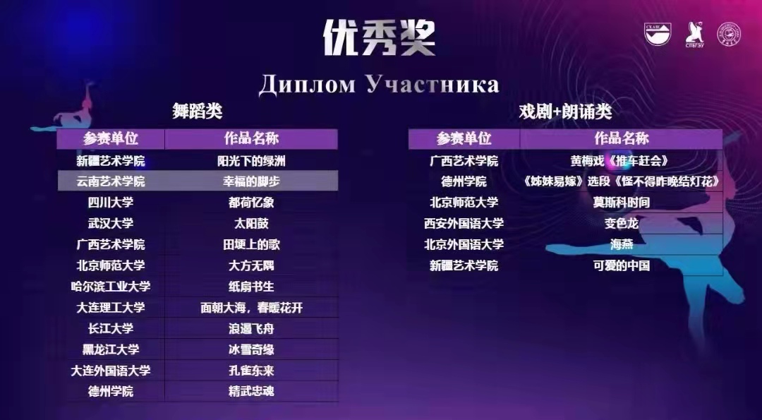 beat365在线唯一官网登录受邀参加“2021中俄大学生艺术联欢节”,舞蹈学院选送的彝族女子群舞《幸福的脚步》在此次“2021中俄大学生艺术联欢节”上获优秀奖。