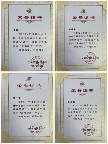 2024年4月27日至28日,由云南省音乐家协会主办的2024中国音乐小金钟——首届全国声乐展演云南选拔活动在云南文学艺术馆举办。本次比赛汇集了云南各高校、省级文艺团体以及各地州音乐家协会推选的优秀选手,经过初赛、复赛、总决赛,音乐学院共10名学生斩获“演唱新秀”“演唱新人”称号,6名教师获优秀指导教师。