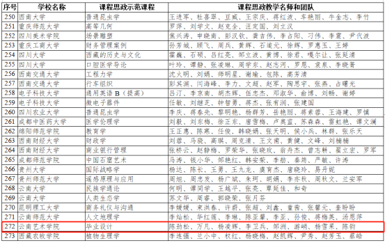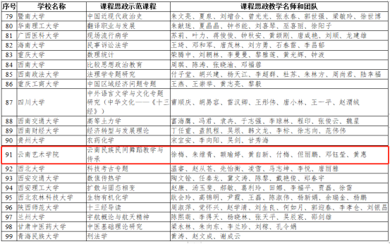 其中,我校一门本科课程——《毕业设计》及教学团队,一门研究生课程——《云南民族民间舞蹈教学与传承》及教学团队,被确定为国家级课程思政示范课程、课程思政教学名师和团队。