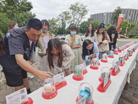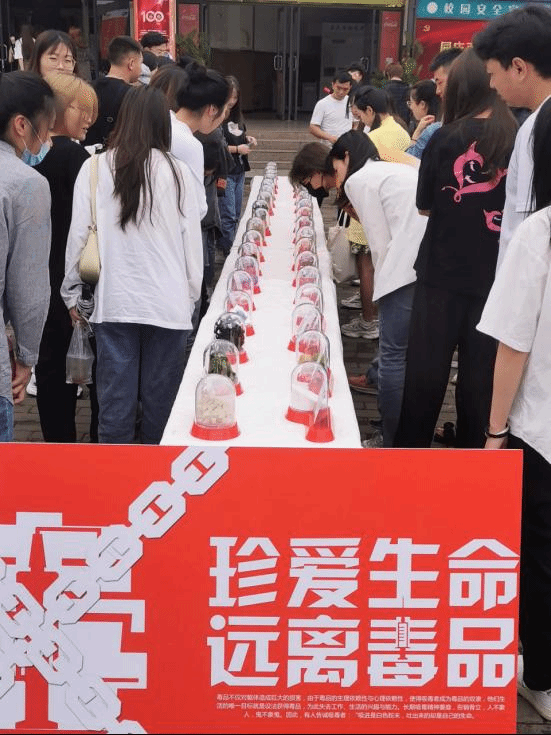宣传讲座结束后,师生驻足在一食堂门口观看毒品(样品、模型)展示和禁毒宣传展板,加强师生对毒品的认知,不仅能近距离感受参与禁毒的意义、责任,而且能深刻领会毒品对社会、家庭的危害。