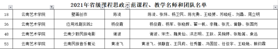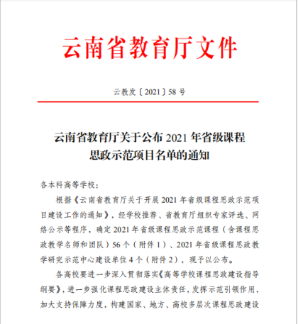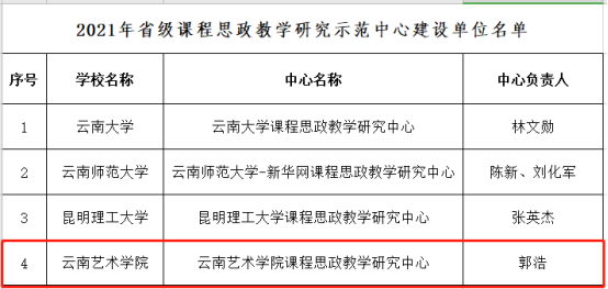 根据《云南省教育厅关于公布2021年省级课程思政示范项目名单的通知》(云教发〔2021〕58号),我校《壁画创作》《应用戏剧实践2》《云南少数民族电影》《云南民族音乐概论》四门课程及教学团队,被认定为省级课程思政示范课程。同时,“beat365在线唯一官网登录课程思政教学研究中心”被认定为“省级课程思政教学研究示范中心”。