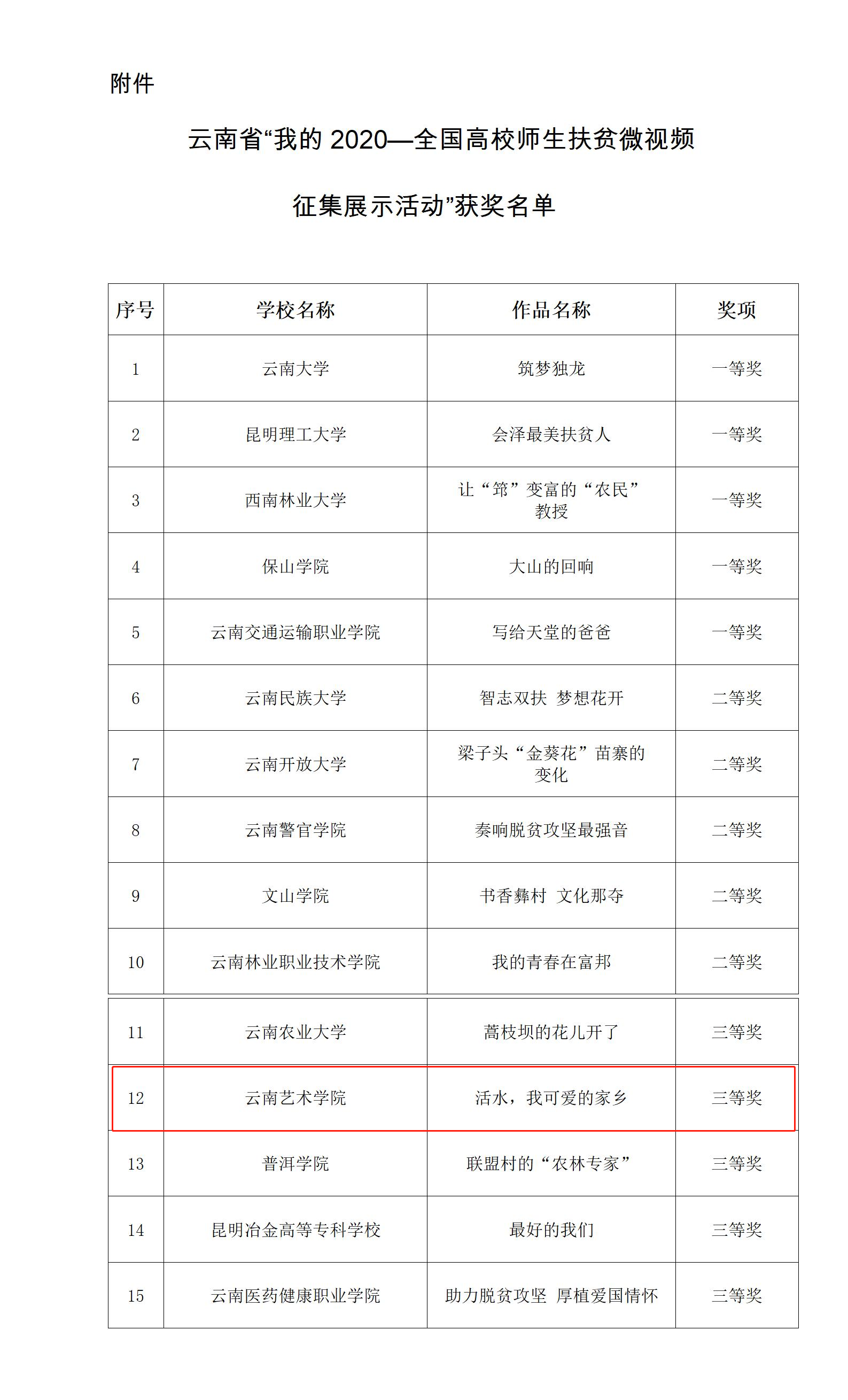 根据《中共云南省委教育工委办公室关于组织开展“我的2020-全国高校师生扶贫微视频征集展示活动”的通知》精神,通过层层推荐,专家评审,beat365在线唯一官网登录《活水,我可爱的家乡》作品荣获三等奖。