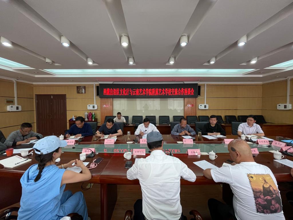 2021年8月2日16:00,附艺校农布七林校长一行,应邀至西藏自治区文化厅进行交流合作座谈及人才培养战略合作签署。西藏自治区文化厅党组书记、副厅长肖传江,文化厅党组成员、副厅长阎平及文化厅办公室、政工处、艺术处、自治区歌舞团、自治区藏剧团、话剧团等负责领导出席了本次交流座谈,会议由文化厅党组成员、副厅长阎平主持。