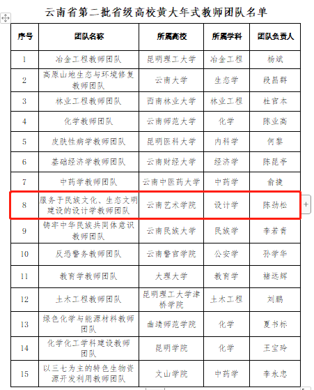 根据《云南省教育厅关于公布云南省第二批黄大年式教师团队的通知》(云教发〔2021〕57号),全省高校中的15个教师团队被认定为第二批“云南省高校黄大年式教师团队”。我校“服务于民族文化、生态文明建设的设计学教师团队”入选。