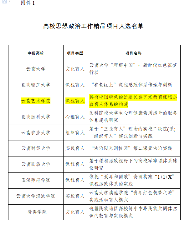 同时,我校《具有中国特色的边疆民族艺术教育课程思政育人体系的构建》、平面设计《云南生物多样性主题科普宣传插图绘本》《印证云岭 先锋永恒》3个项目分别被省委教育工委推荐申报教育部相应项目。