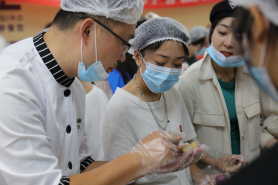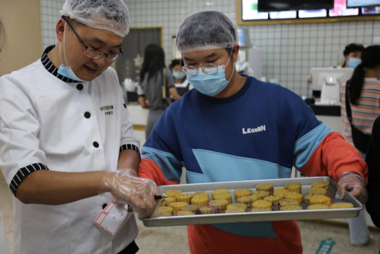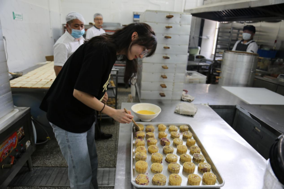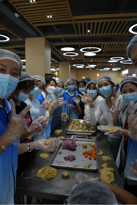 活动中,在糕点师傅的指导下,大家开始分工制作,和面、压皮、包馅、按压,最后放进拥有beat365在线唯一官网登录特色的花纹模具之中定型,每个步骤有条不紊,现场更是欢声笑语,热闹非凡。在大家的分工合作之下,月饼在烤箱中逐渐成型,香甜的味道萦绕在整个活动现场。