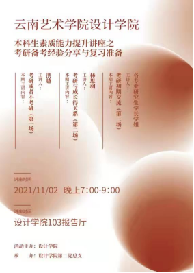 为了让更多想要考研的同学了解如何做考研的准备,了解考研的趋势,增加同学们对考研的信心。2021年11月2日晚上7:00,第二次考研分享公益讲座在103报告厅举行。本次讲座由设计学院研一研二在读研究生洪越、林思羽两位同学进行自己的考研经历分享。分别从《考研or不考研》和《考研与成长的关系》分享了“考研现状的大趋势”、“考研和就业”、“研究生的学习生活”、“考研后的个人提升”几个方面。