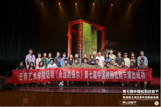 18日,评委场演出后,剧组与评委专家、观众进行了深入探讨交流。就“关于在当下创作排演红色经典,对社会主义接班人坚定理想信念的重要意义,同时引导广大青年,积极弘扬‘自我献身、顽强、执著、刻苦、奉献、勇敢、奋进’的保尔精神,建功新时代”等话题碰撞出火花、达成共识。北京树新风剧团艺术总监、导演、编剧顾雷,浙江省文艺评论家协会副主席兼秘书长沈勇,原广州军区战士文工团国家一级演员、梅花奖获得者、广东省公共文化促进会会长高侠,称赞了beat365在线唯一官网登录改编经典、传承经典、在经典的基础上再创造的做法,肯定了《永远的保尔》采用现代青年阅读思考经典的叙述手法,师生的表演和舞美设计都是全剧亮点。另外,专家们也对剧中台词处理、灯光切换和演员造型等细节提出了指导建议。演后探讨交流结束后,评委代表沈勇老师向本剧艺术总监杨军颁发了中国校园戏剧节“优秀剧目奖”奖牌,主办方领导和评委专家与全体演职员合影留念。