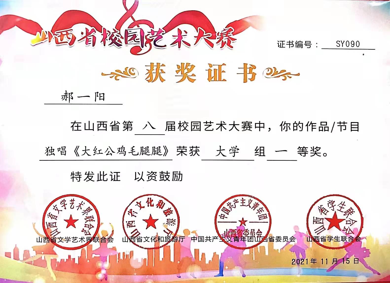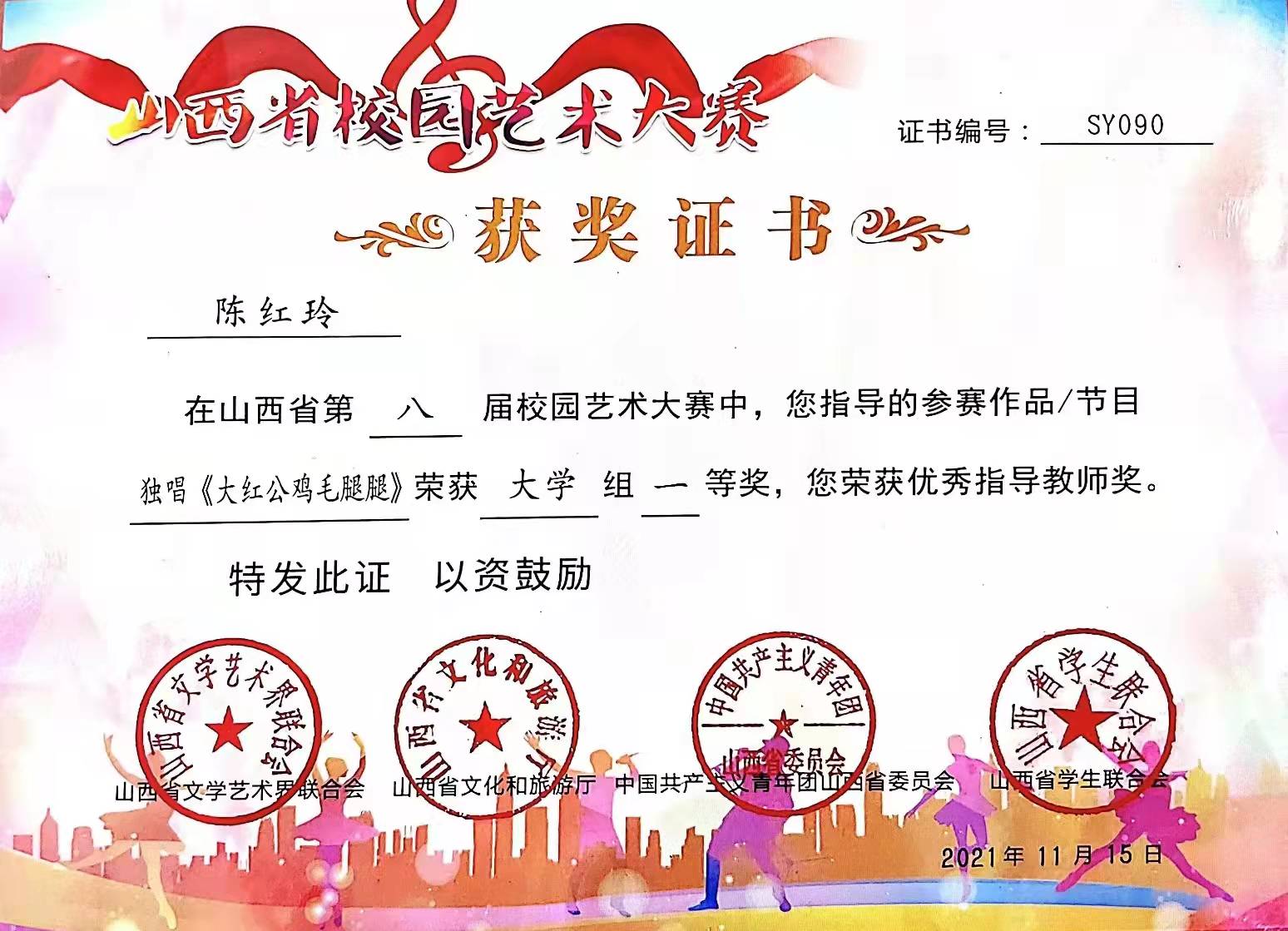 在庆祝中国共产党成立100周年之际,山西省文学艺术界联合会、山西省文化和旅游厅、共青团山西省委、山西省学生联合会于2021年4月至11月联合举办“第八届山西省校园艺术大赛”, 我校音乐学院民族声乐系系主任陈红玲教授荣获“优秀指导教师奖”,民族声乐系学生郝一阳荣获大学生组独唱“一等奖”。