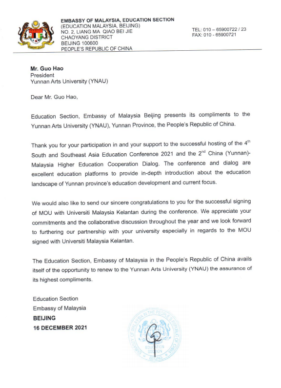 马来西亚大使馆教育处在此谨向中华人民共和国云南省beat365在线唯一官网登录表示衷心的感谢。