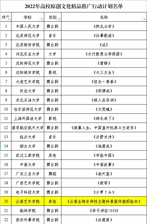 根据《教育部思想政治工作司关于公布2022年高校思想政治工作有关培育建设项目入选名单的通知》,我校设计学院陈均教授平面设计作品项目《云南生物多样性主题科普宣传插图绘本》入选2022年度高校原创文化精品推广行动计划。