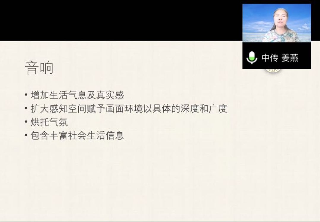 姜燕教授从声音与生活的关系切入,深入浅出阐述了观察生活和体验生活中积累自己对声音的敏锐度和艺术表达能力,关注生活中声音背后的“听点”和“视角”,用各时期影视声音创作代表性电影经典案例做了分享,娓娓道来如何理解影视声音艺术表达的切入点。