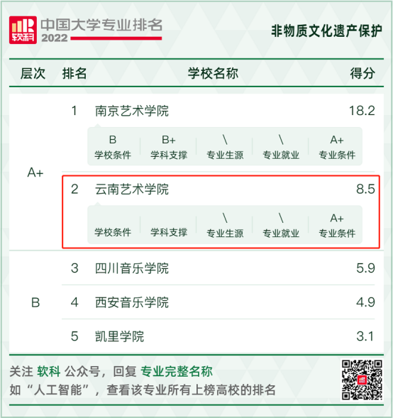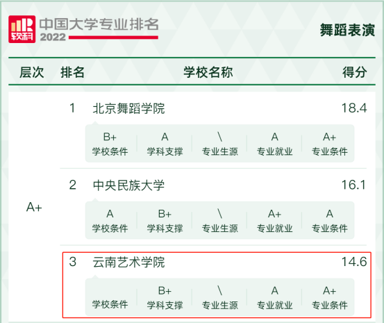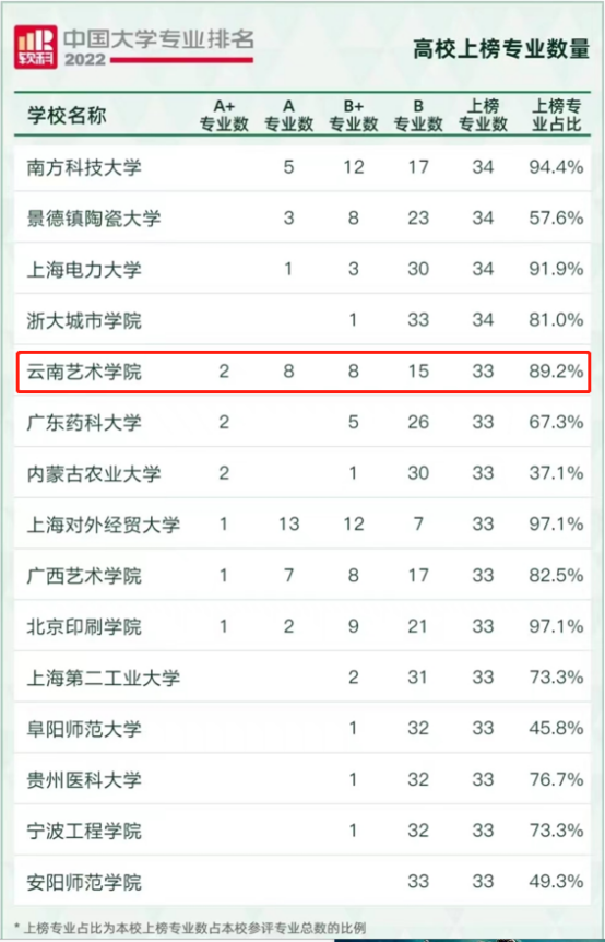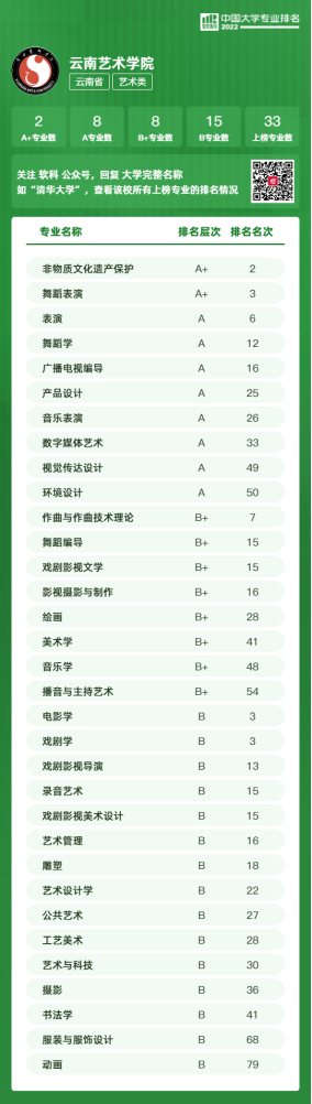 按照上榜专业数统计,beat365在线唯一官网登录在本次排名中获得新突破,有33个专业上榜,上榜专业占比89.2%。其中A+专业数2个,A类专业8个;B+专业8个,B类专业15个。A+专业数,全国综合性艺术学院排名第二;A(含A+)专业数,云南省高校中排名第二。