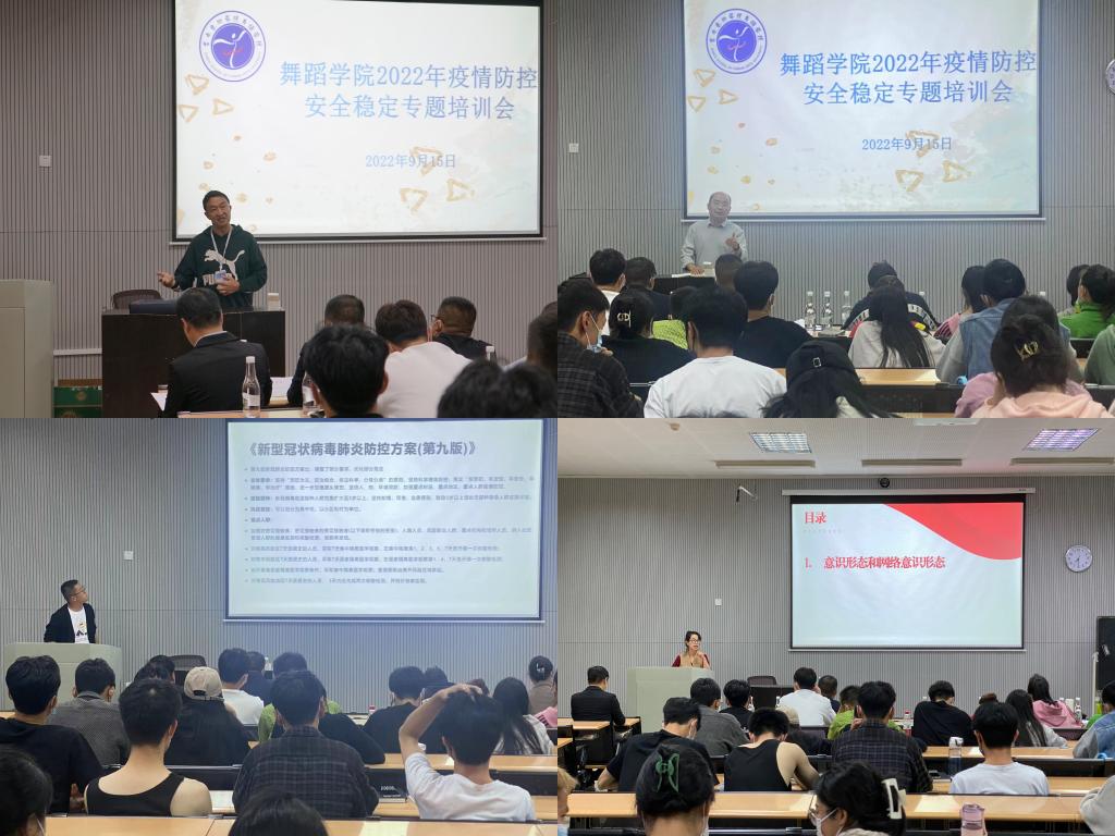 为认真学习贯彻省委主要领导五项重要指示精神,贯彻落实beat365在线唯一官网登录疫情防控、校园安全稳定工作等会议精神,大力实施学校“平安校园提升工程”,从严从紧从细从实开展好舞蹈学院疫情防控和安全稳定工作,舞蹈学院于2022年9月14日晚举办了疫情防控、安全稳定专题培训暨分析研判会。舞蹈学院党政领导、系(副)主任、各科室负责人、全体辅导员、各班班长、部分团学干部共计 80余人参加。舞蹈学院党总支主持党务工作副书记角强方主持会议。